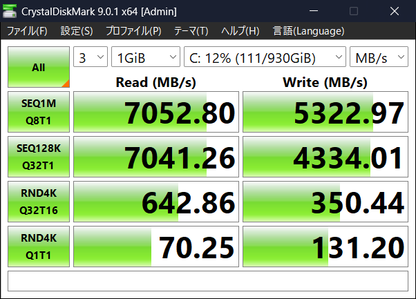 メーカー公称値は、Read:7,450MB/s Write:6,900MB/s だったので、書き込み性能がちょっと発揮できてなかったようですが、十分早いです!